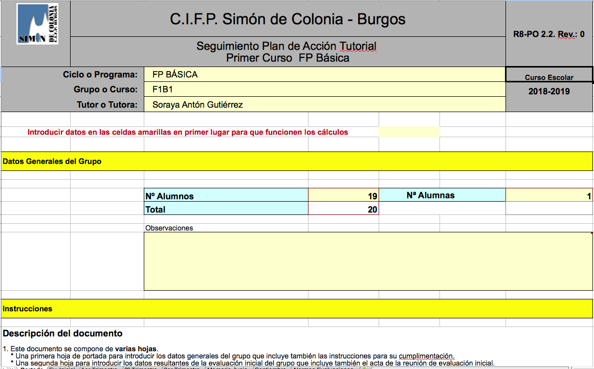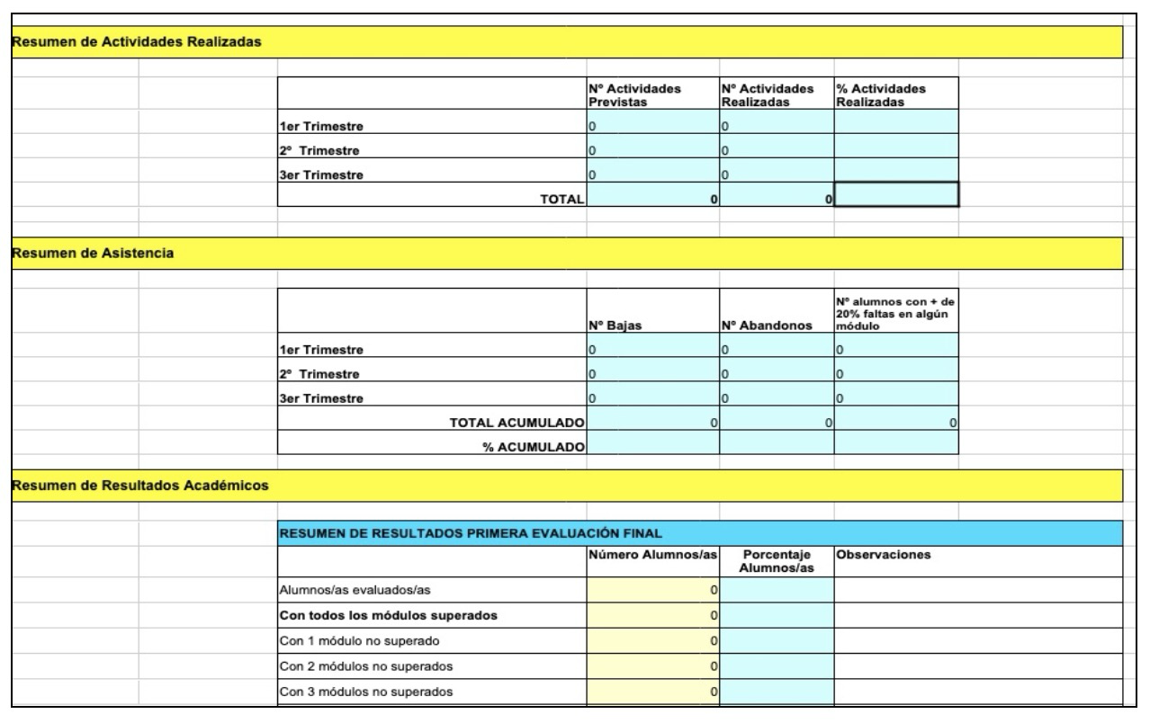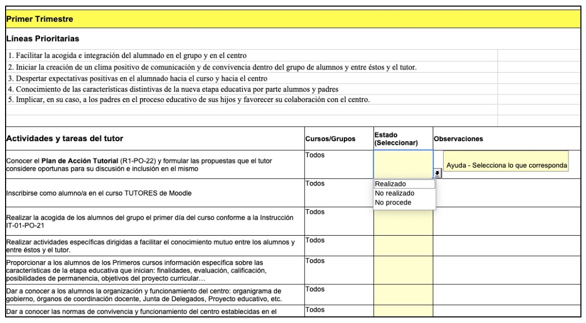 - Es un documento de hoja de cálculo en el que hay varias hojas (una por trimestre) con el listado de tareas y actividades que el tutor o tutora va realizando a lo largo del curso